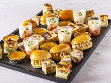 Pâté en croûte pistache, toast cabillaud caviar Avruga, carpaccio de saumon gravlax sauce aneth, tartelette tomate courgette, brochette St Jacques chorizo