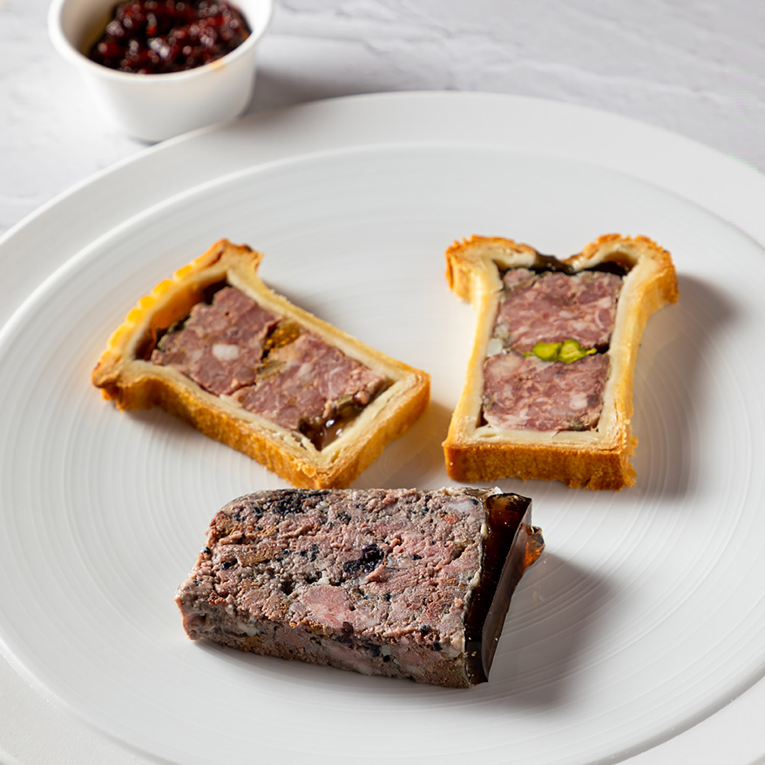 Terrine du Chanoine au canard et cassis, Mini paté croûte pistaché et Mini paté croûtes figue/ foie gras