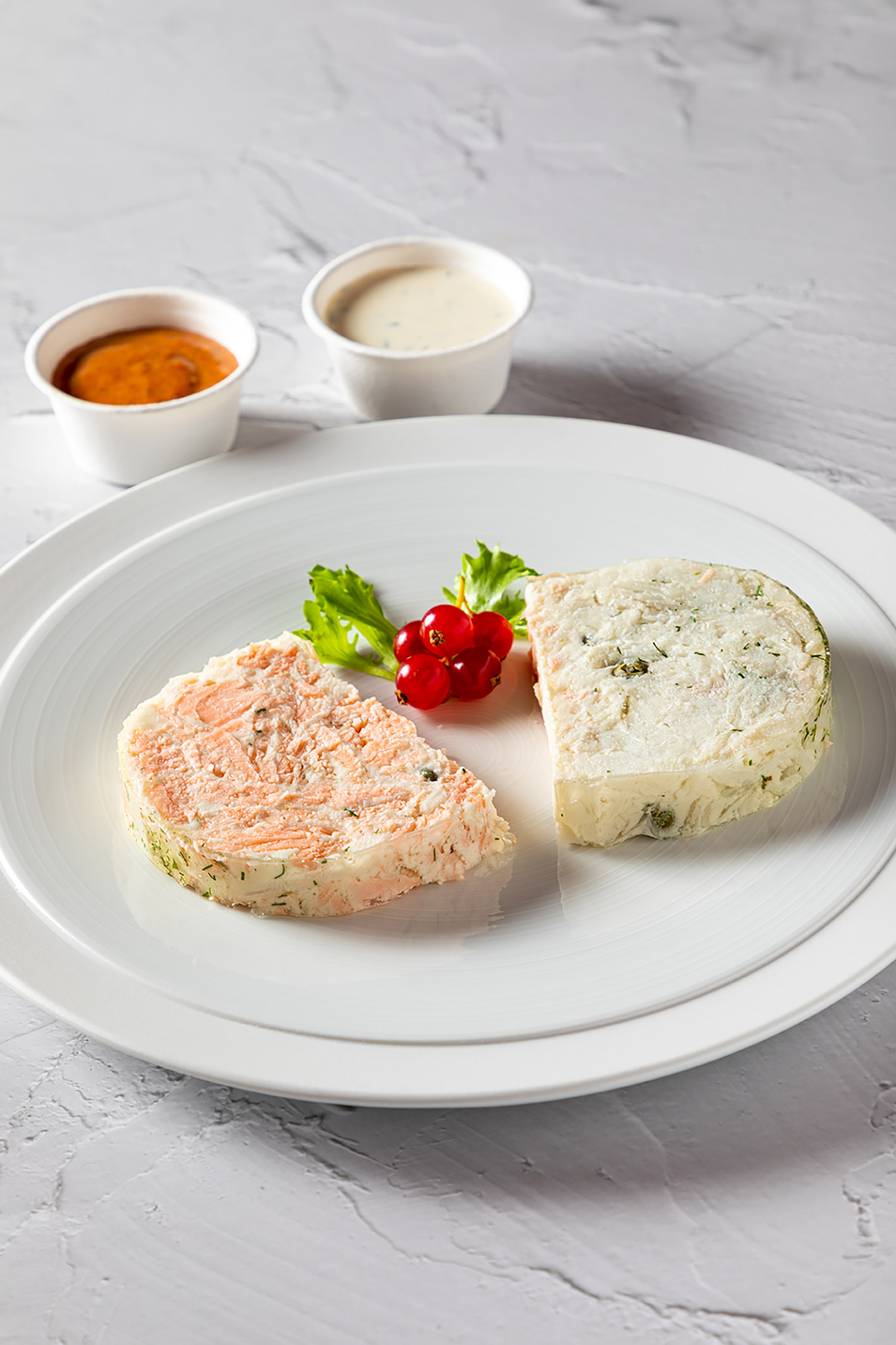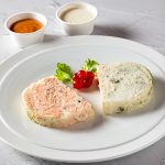 Terrine d’aile de raie aux câpres, Terrine de saumon frais et fumé, jus de tomates rôties, sauce ciboulette