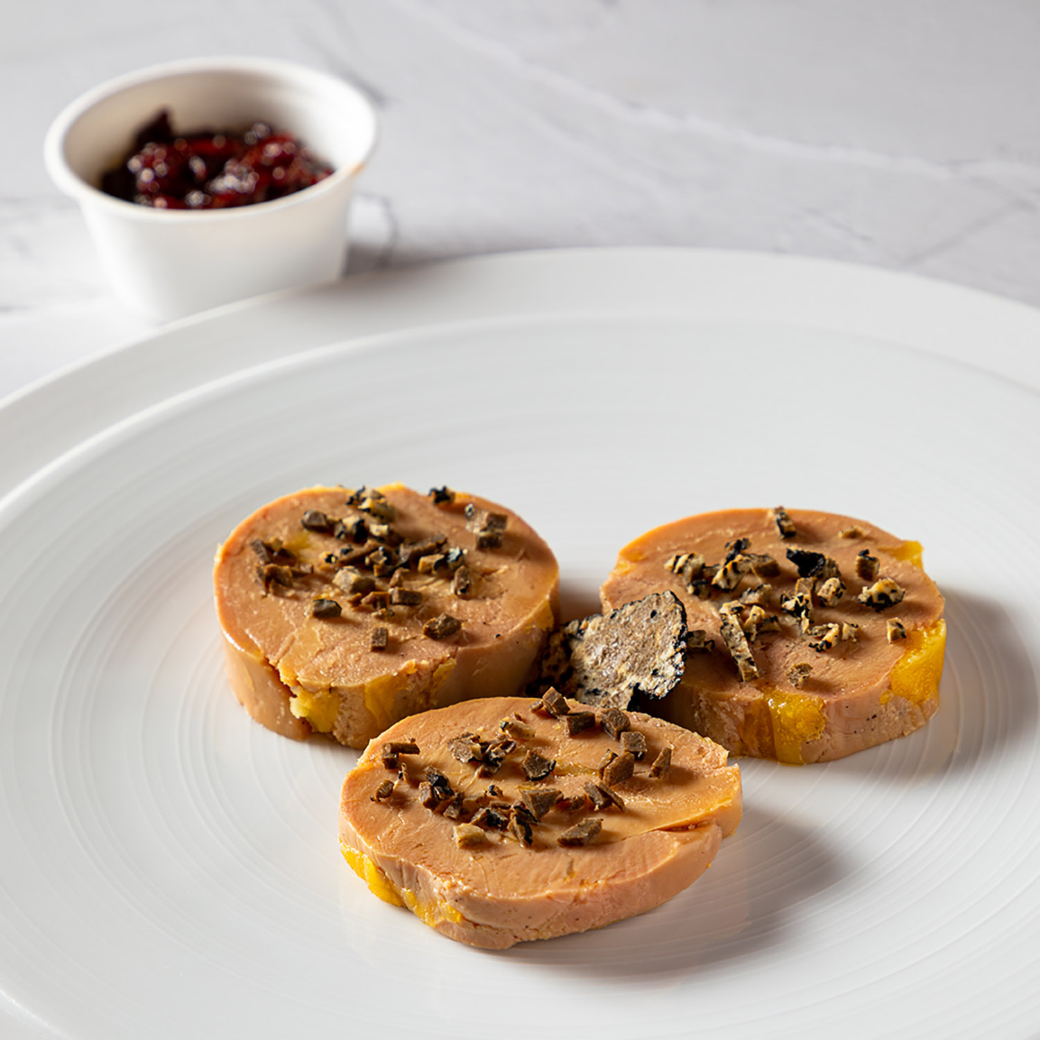 Foie Gras mi-cuit IGP du Sud-Ouest, truffes noires mélanosporum, chutney figue/cassis