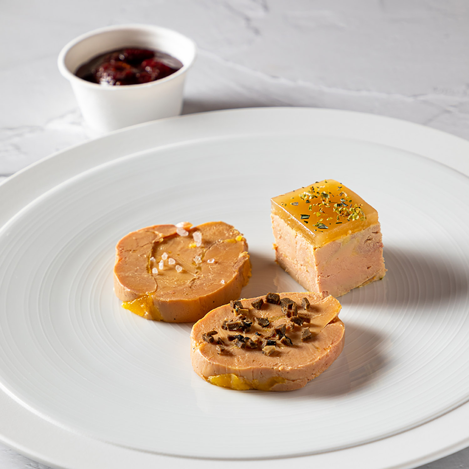 Foie gras mi-cuit IGP du Sud-Ouest nature, truffé (truffe noire mélanosporum) et à la gelée de pommes (et éclats de poivre), Chutney de Piquillos