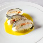 Filet de bar farci aux amandes torréfiées, cébette et gambas, sauce safranée