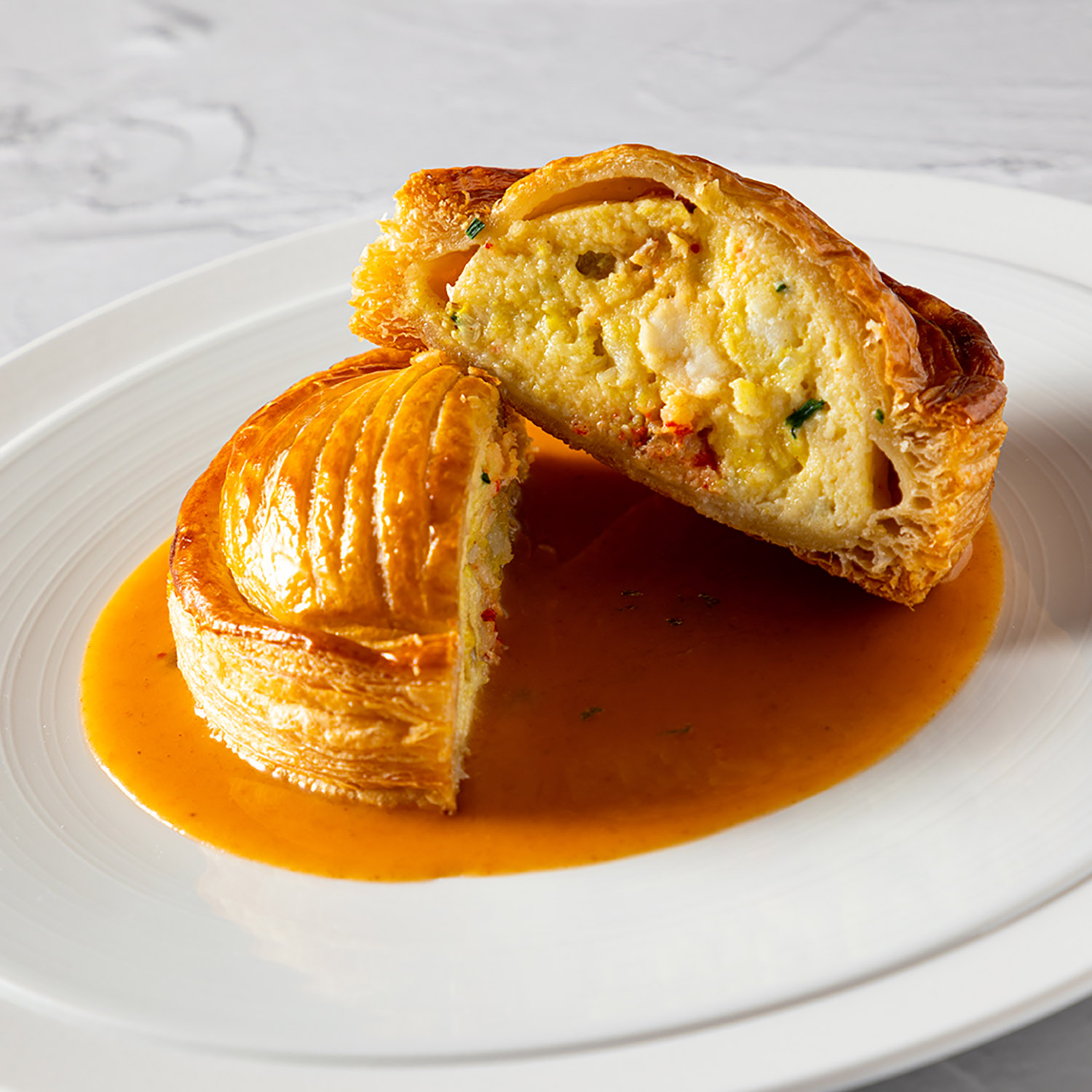 Pate feuilletée maison, mousseline de cabillaud, brisures de homard, sauce crustacés