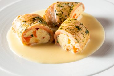 Ballotine de Saumon farçi aux noix de st jacques et écrevisse, sauce beurre blanc