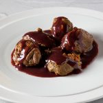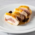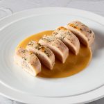 Cuisse de poularde entièrement désossée, garnie d’une farce volaille foie gras et truffe, sauce au vin jaune de Pupillin