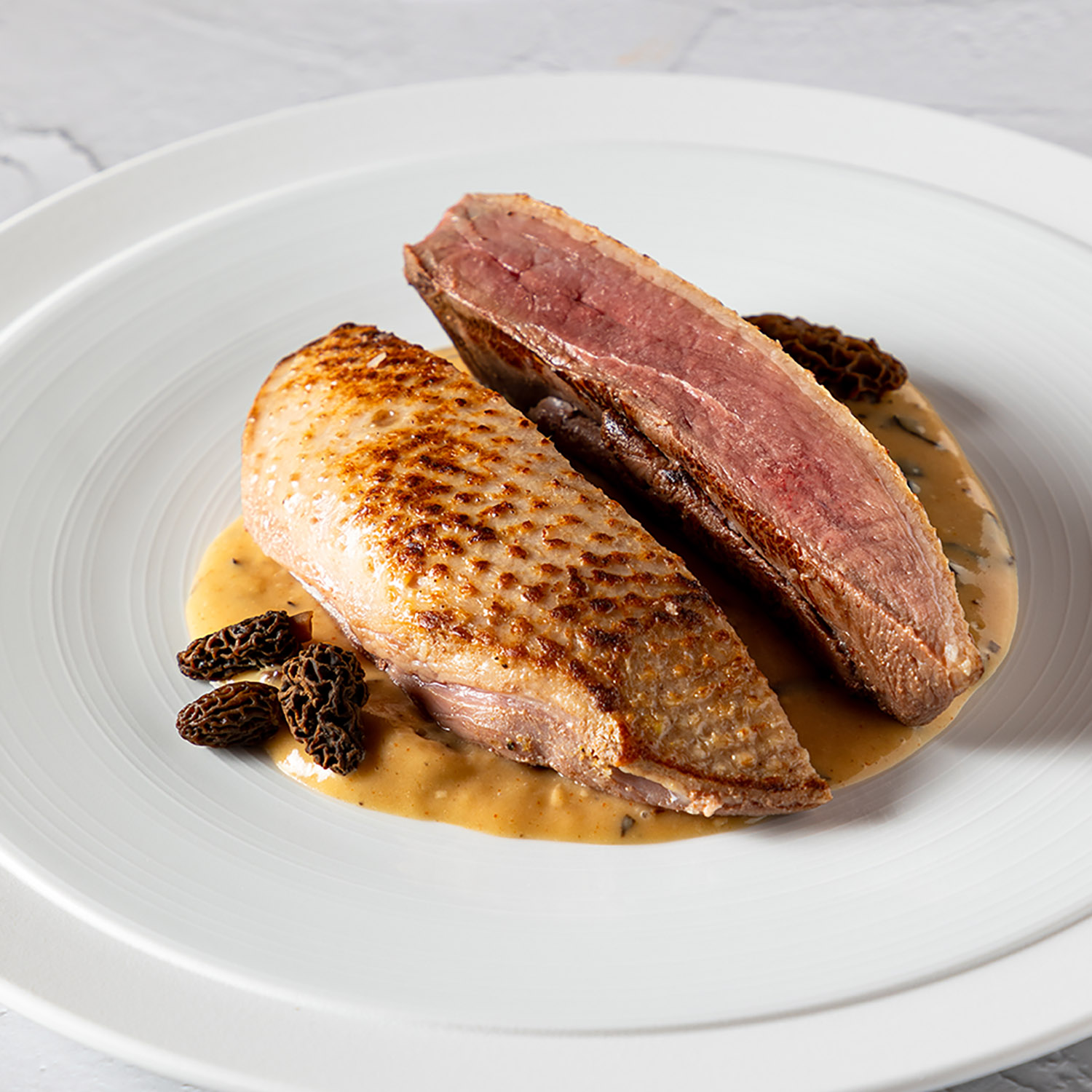 Filet de canette braisé, coriandre et poivre noir, sauce aux morilles