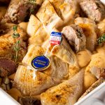 Présentée entièrement desossée et découpée dans son plat prêt à réchauffer, accompagnée d’une garniture de marrons d’Ardèche