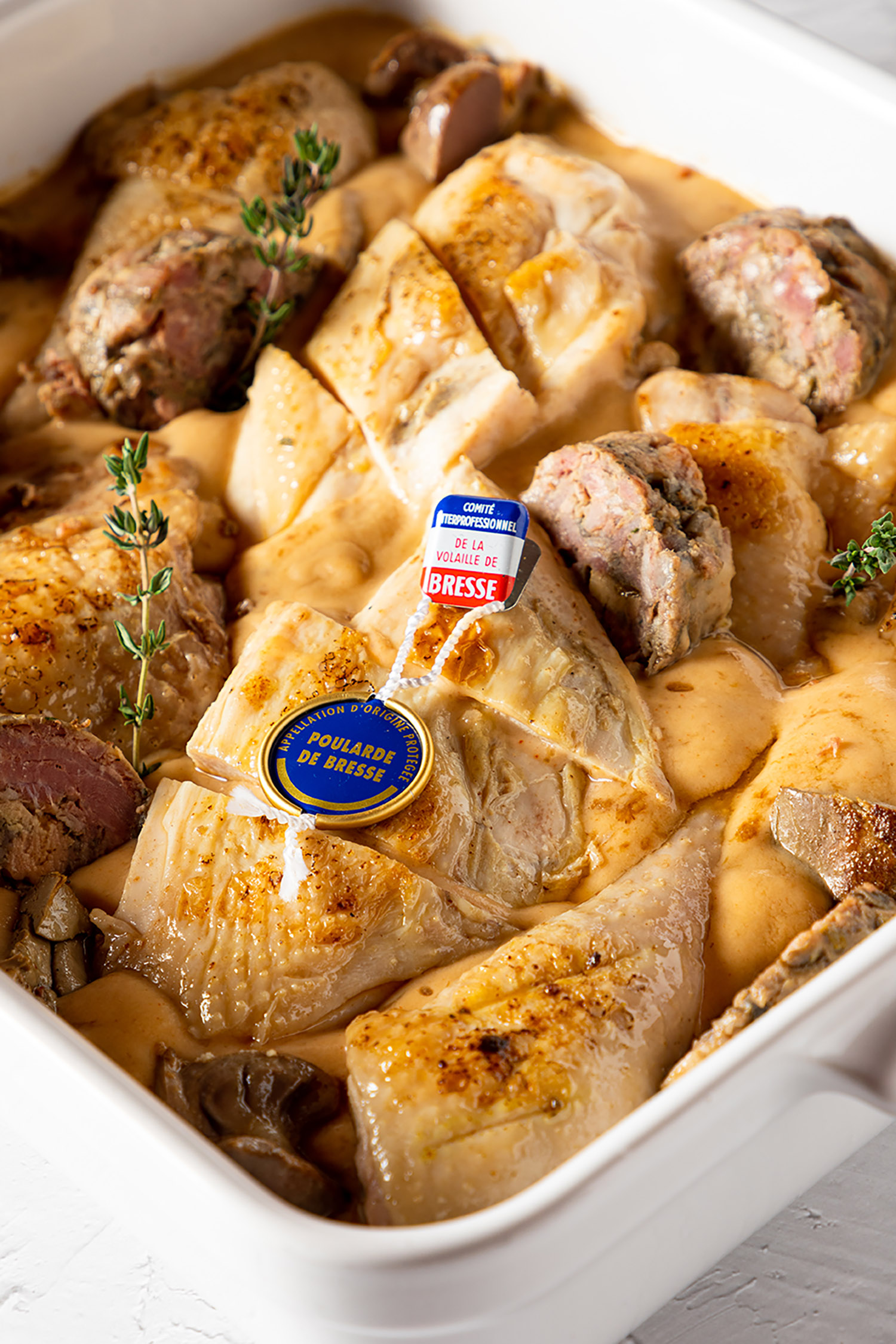Poularde de bresse entièrement découpée, farce fine au foie gras, sauce aux cèpes. Pour 4 à 6 pers, a réchauffer directement dans son plat