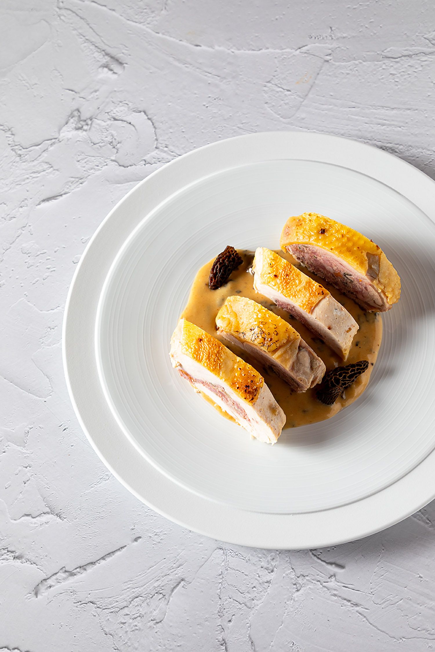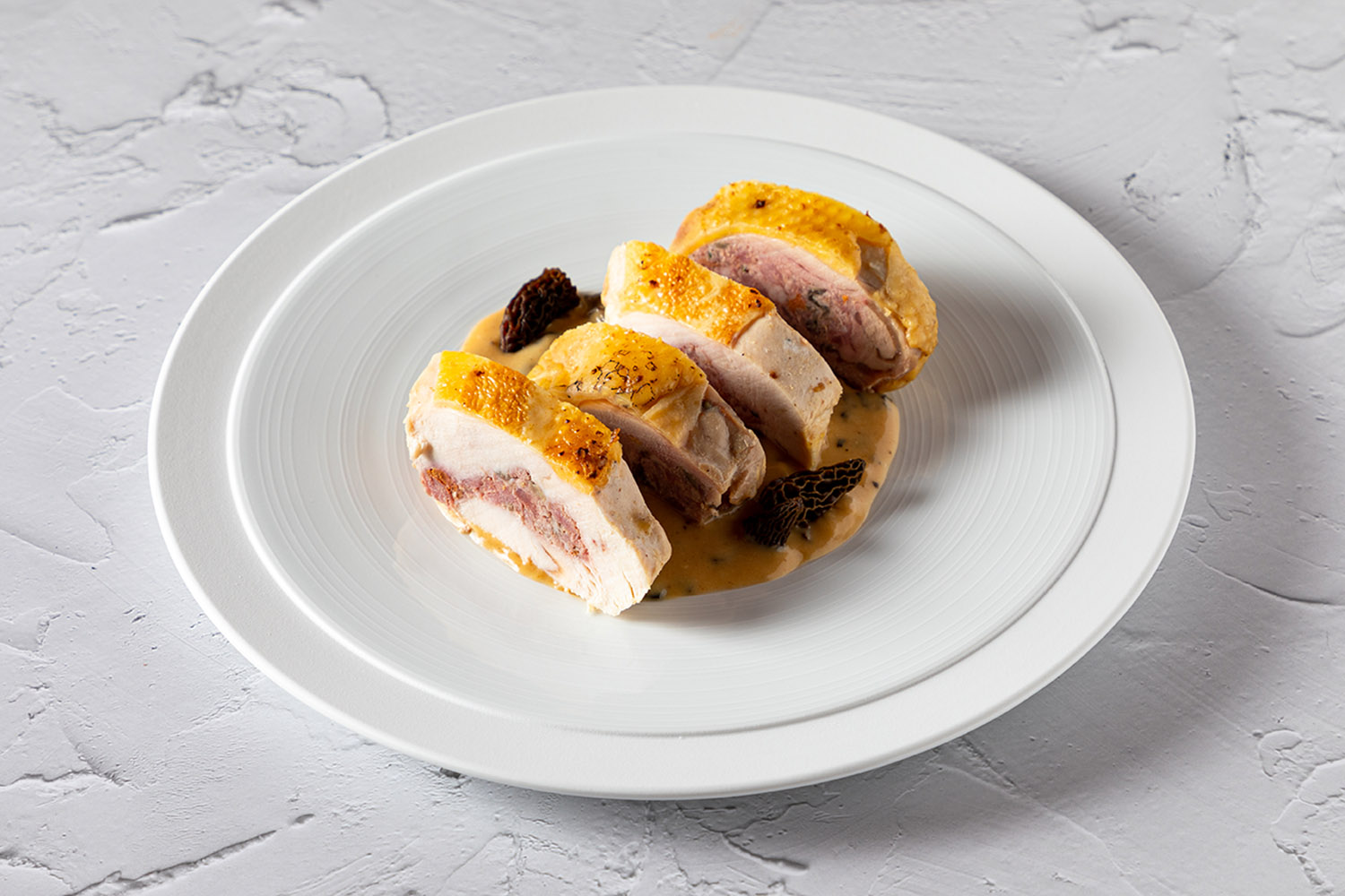 Cuisse de poularde entiÚrement désossée farci au foie gras sauce savagnin