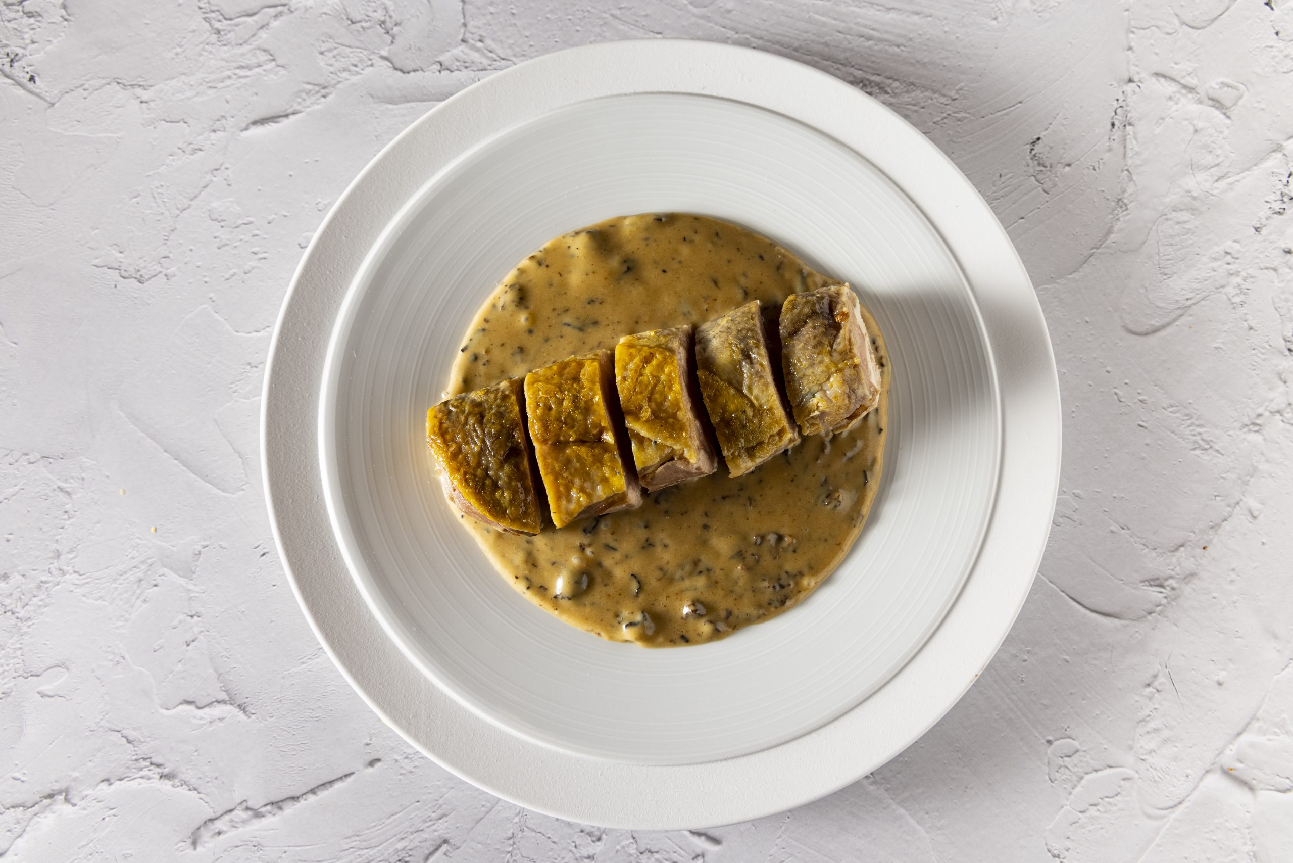 Cuisse de poularde entièrement désossée farci au foie gras sauce savagnin