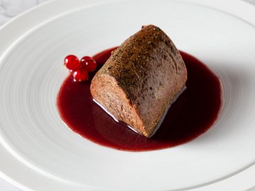 Pavé dans le filet rôti avec aromates, cuisson saignantes. Sauce grand veneur