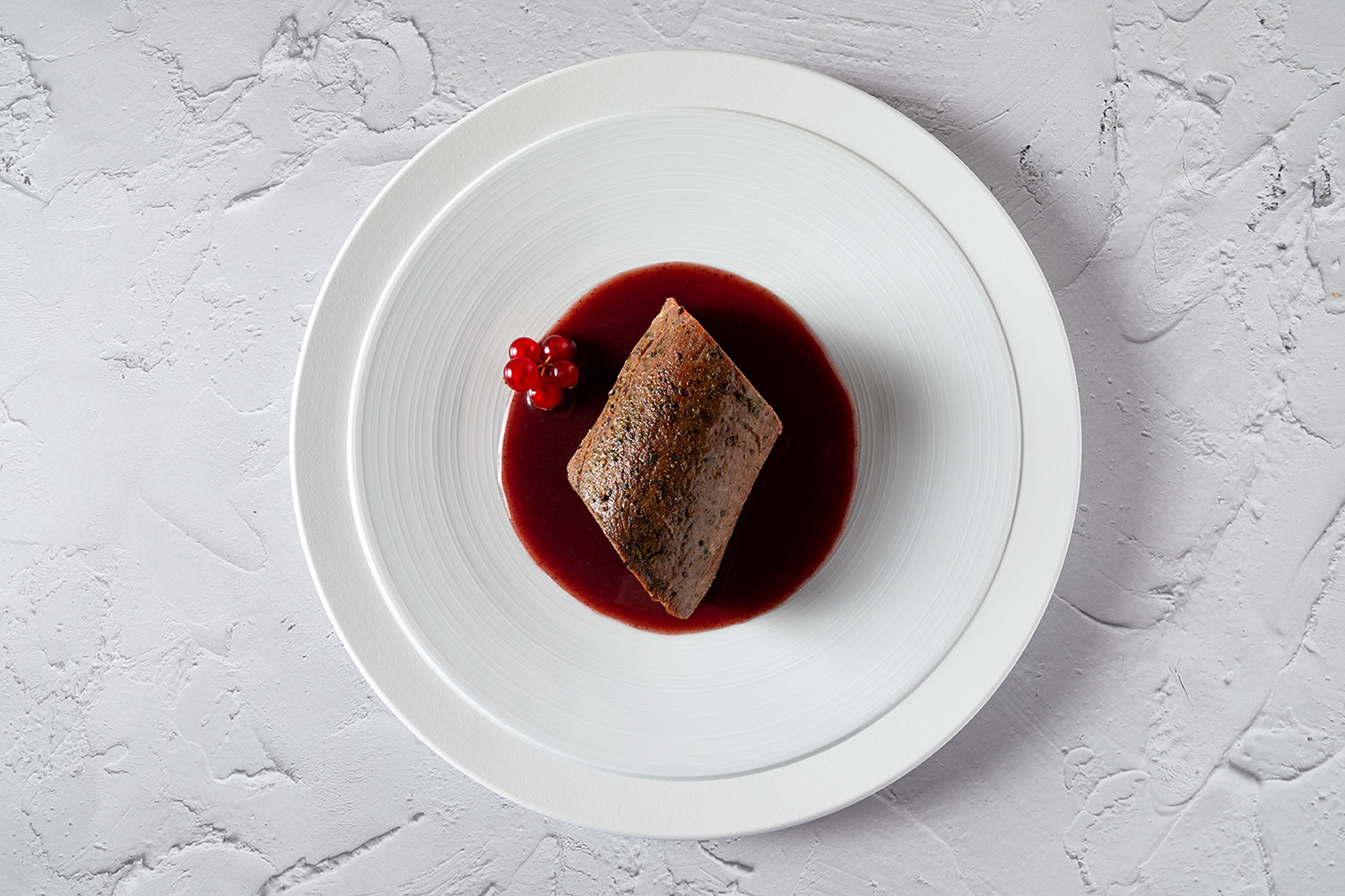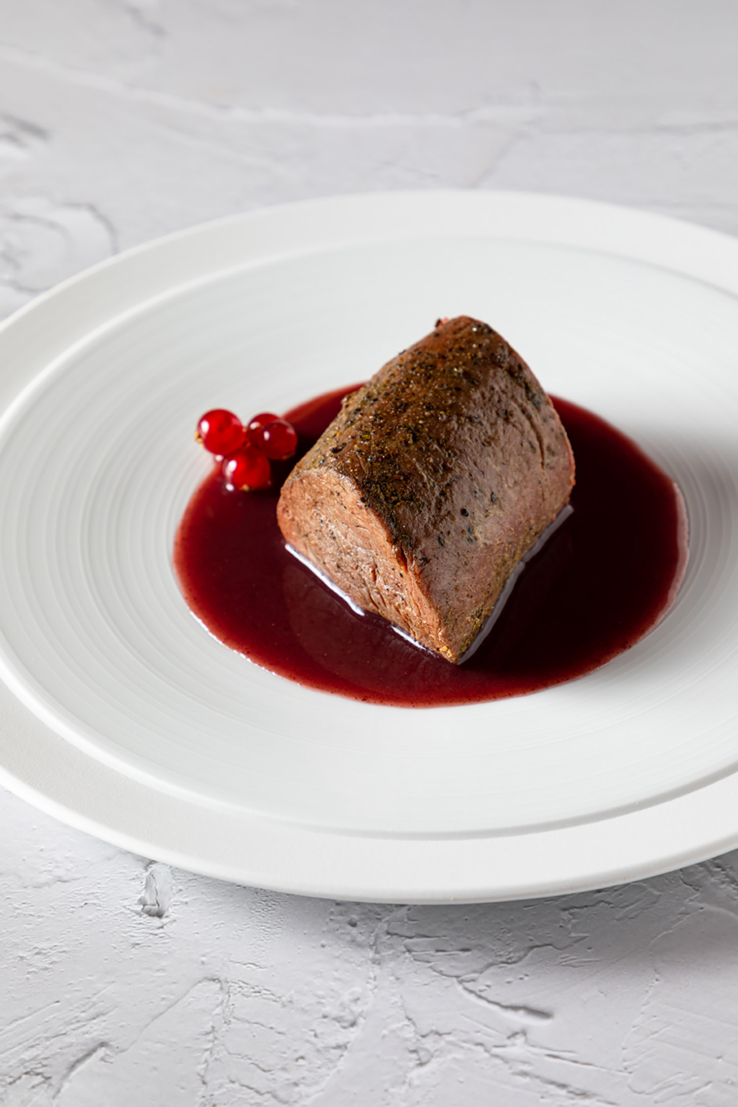Pavé dans le filet rÎti avec aromates, cuisson saignantes. Sauce grand veneur