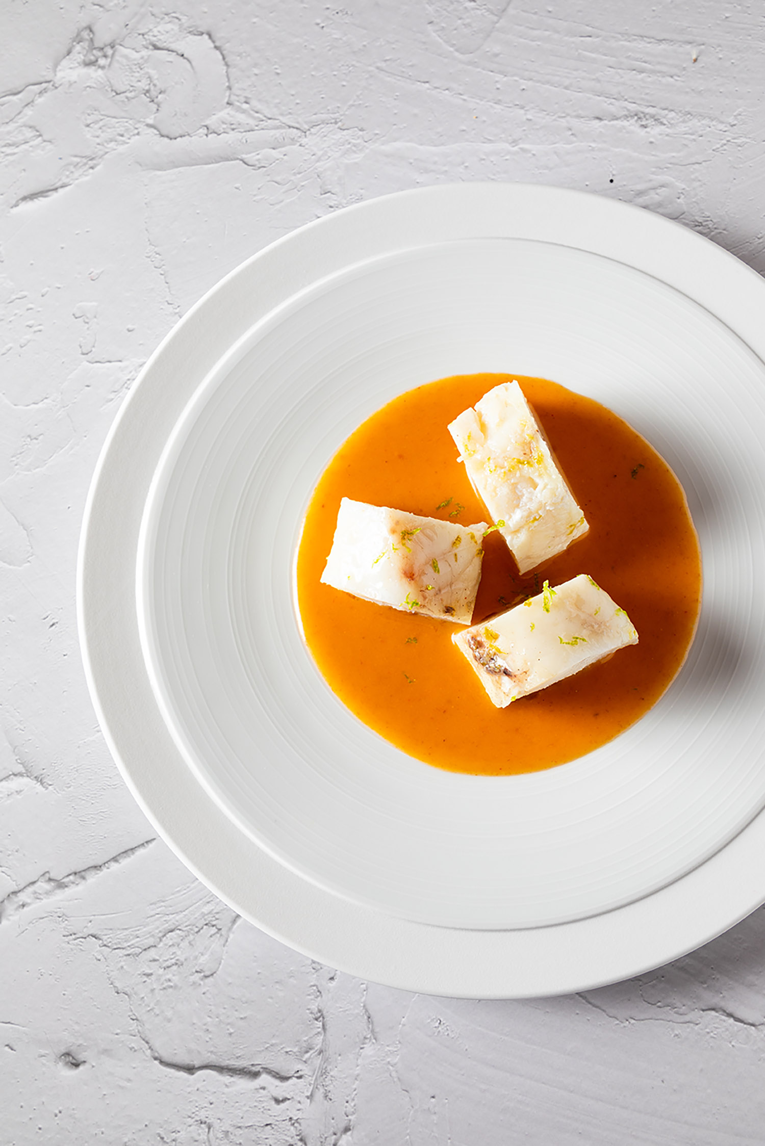 lotte de Roscoff, cuisson à juste température, agrumes et baies de Timut, Sauce à la Bisque de homard réduite